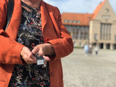 Bei dem Schlüsselanhänger handelt sich um eine kleine Plastikkarte, die mit einem QR-Code bedruckt ist, auf dem die Kontaktdaten der Nutzerin bzw. des Nutzers hinterlegt sind.